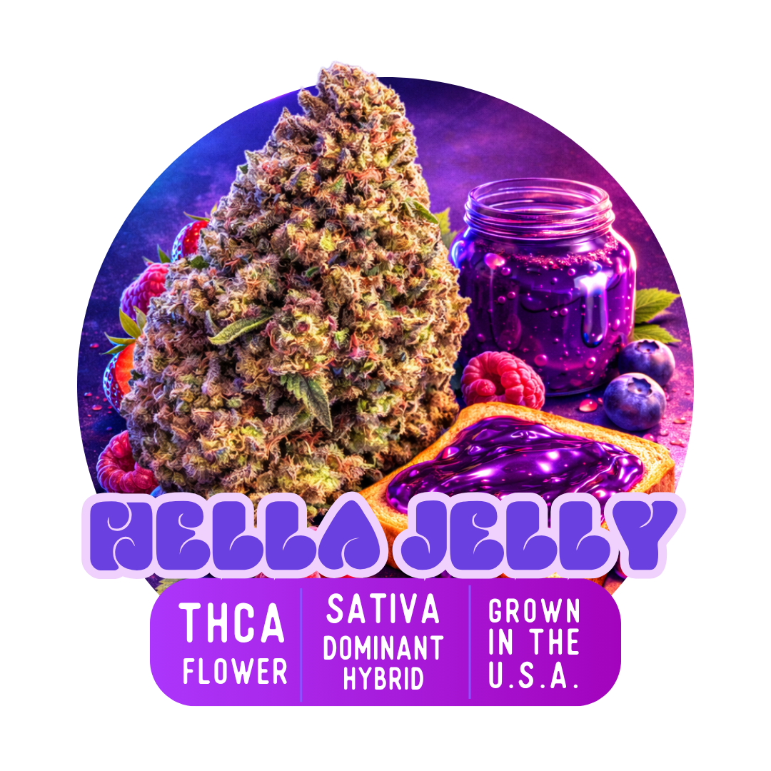 Hella Jelly, also known as Jelly Rancher, is a sativa-dominant hybrid bred through a cross of Very Cherry and Notorious. Its dense, chunky buds are a visual standout, showcasing neon greens and golden hues beneath a heavy blanket of golden-white trichomes, with fiery red-orange hairs woven throughout. The aroma is an immediate hit of candy shop sweetness, bursting with blue cotton candy, fresh strawberries, sugary grapes, and tropical mango jelly that lingers long after opening the jar. The flavor matches perfectly, delivering a bold berry and cherry sweetness on the inhale and a gassy, sugary citrus exhale that coats the palate. The experience sets in quickly, arriving as a sharp wave of euphoria and mental clarity that sharpens focus and sparks creativity without feeling scattered or anxious. It is well-suited for daytime use, keeping you motivated and sociable while a gentle body relaxation settles in behind the cerebral lift. Its terpene profile, led by caryophyllene, myrcene, and humulene, contributes both to its vibrant fruity aroma and its mood-boosting, anti-inflammatory potential. Sources consistently indicate Hella Jelly for relief from stress, depression, and fatigue, making it a great daytime companion for those seeking a functional and flavorful experience.Â