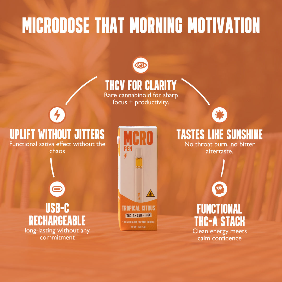 The MCRO Tropical Citrus Pen delivers a controlled, uplifting experience designed to keep you engaged and dialed in. This sativa-leaning blend pairs THCa with high CBD and a functional dose of THCv, creating a clear-headed, motivating sensation without unnecessary intensity.