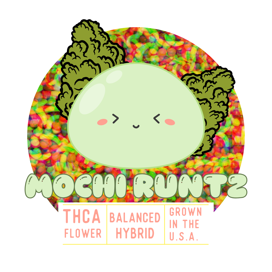 Mochi Runtz combines Mochi and Runtz into a perfectly even 50:50 hybrid. Its dense, frosty buds release sugar, vanilla, and ripe berry notes with an earthy undercurve. The experience begins with a soft lift that steadies into full-bodied ease—a calming cradle for body and mind. It’s often chosen to soothe tension while nurturing creative moods, easing mild discomfort, or nudging appetite. The visual and sensory richness of Mochi Runtz makes it a standout comforting companion.